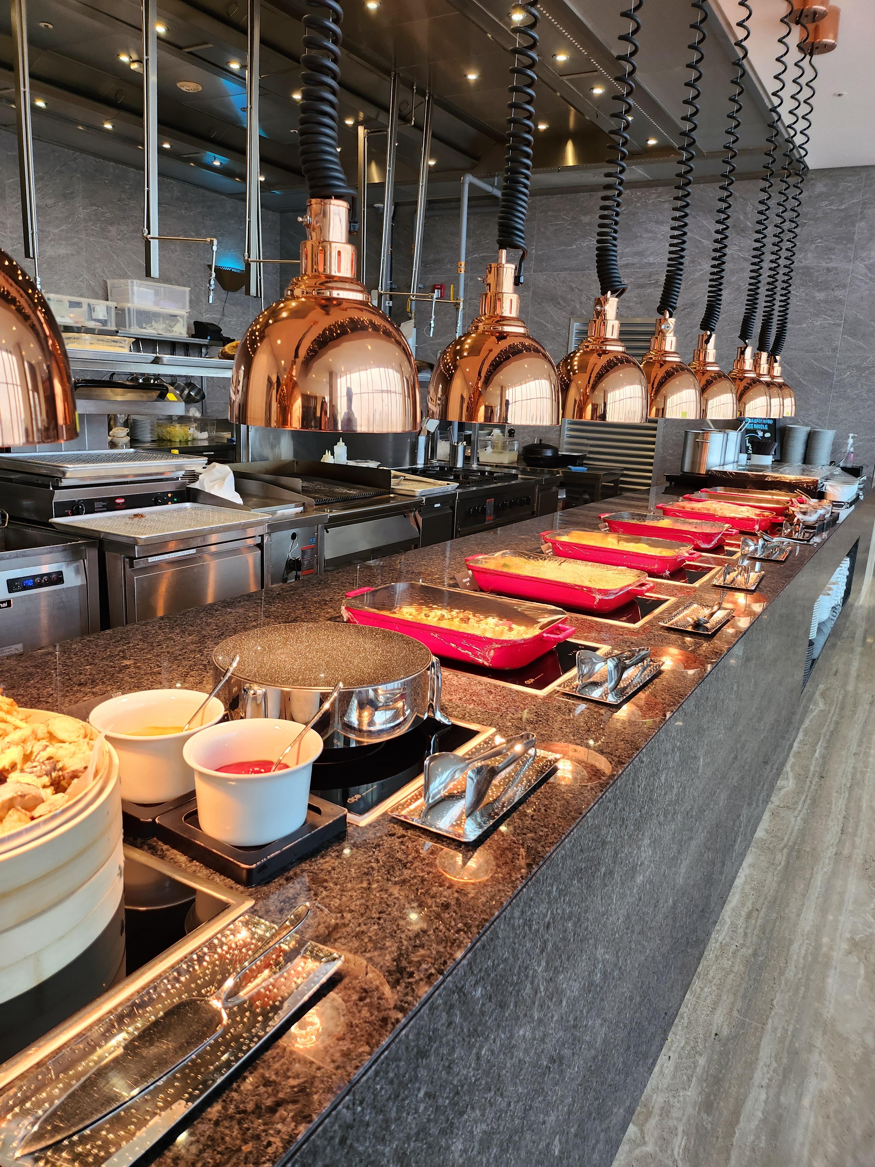 뇨끼, 그라탕, 모듬튀김, 볶음밥, 왕사비 크림새우, 유린기, 수비드 삼겹살, 훈제연어, 각종 샐러드, 가리비세비체, 각종 회
