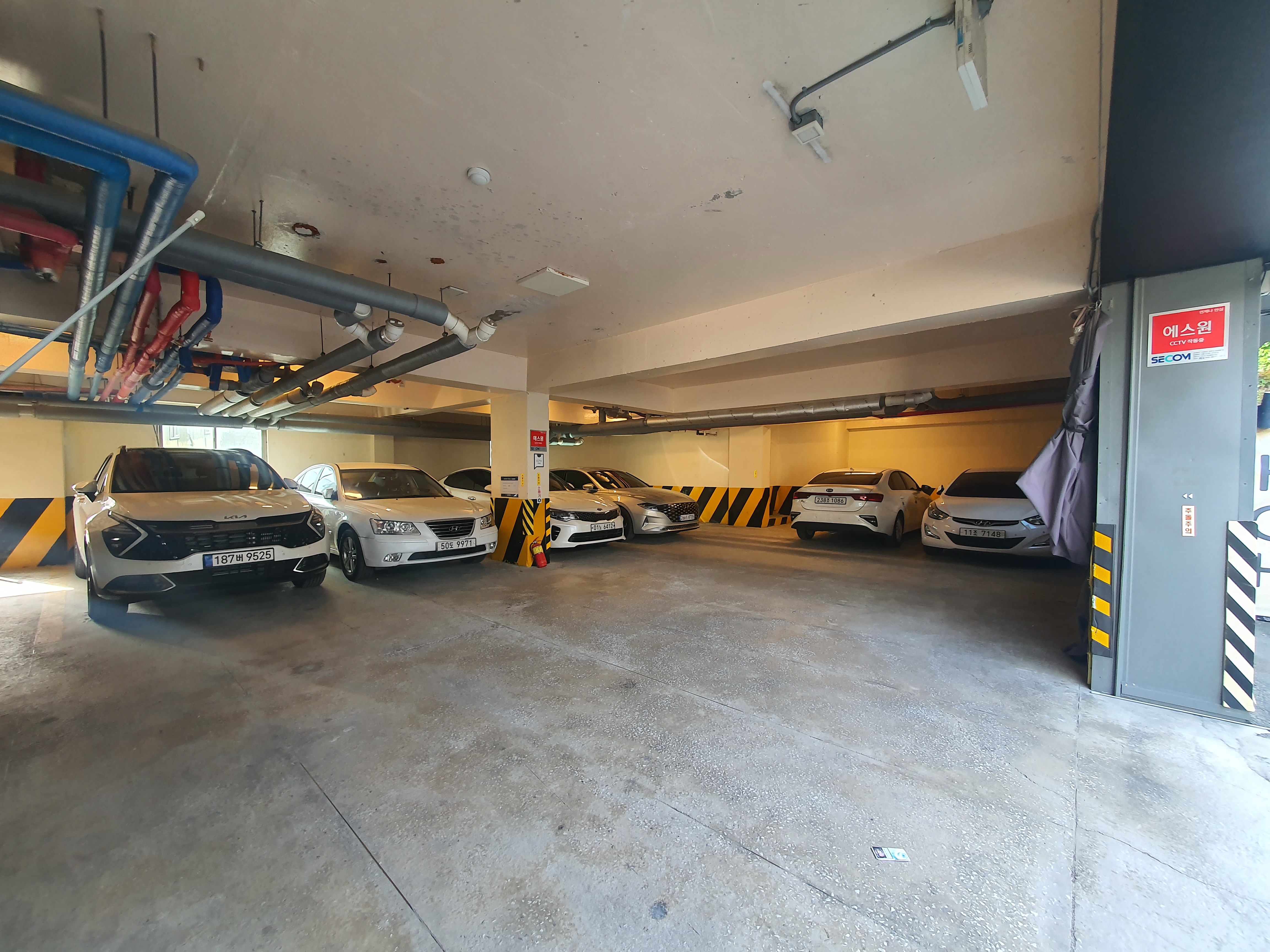 본 건물 1층에 6대까지 주차할 수 있고, 건물 뒤편 3대 + 2~3중 주차