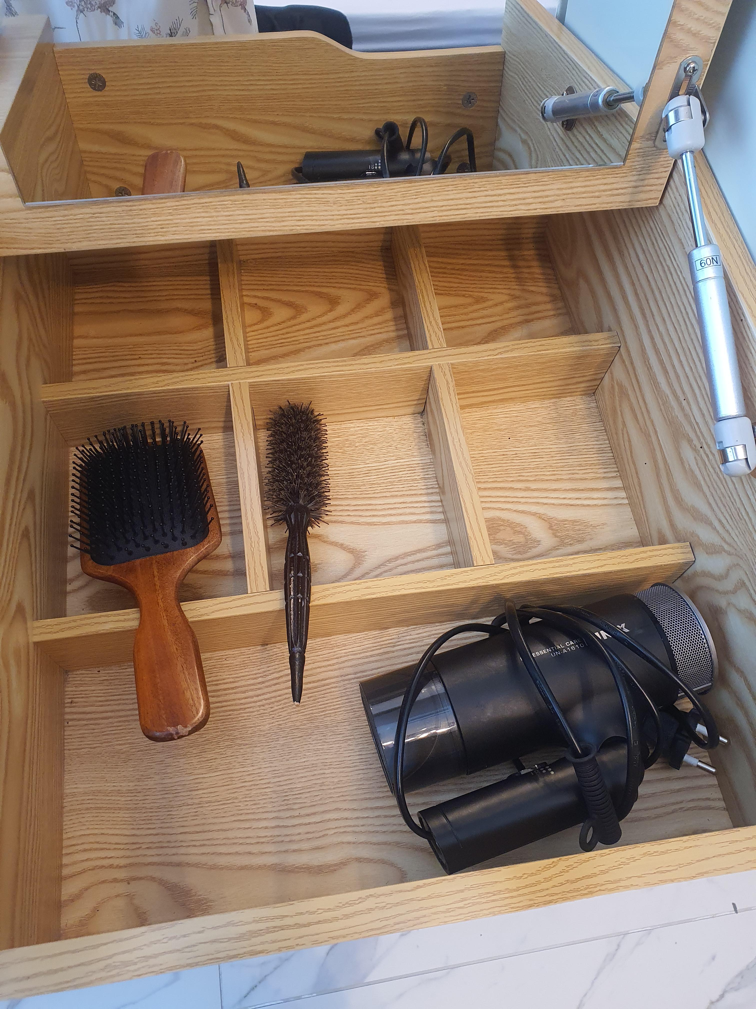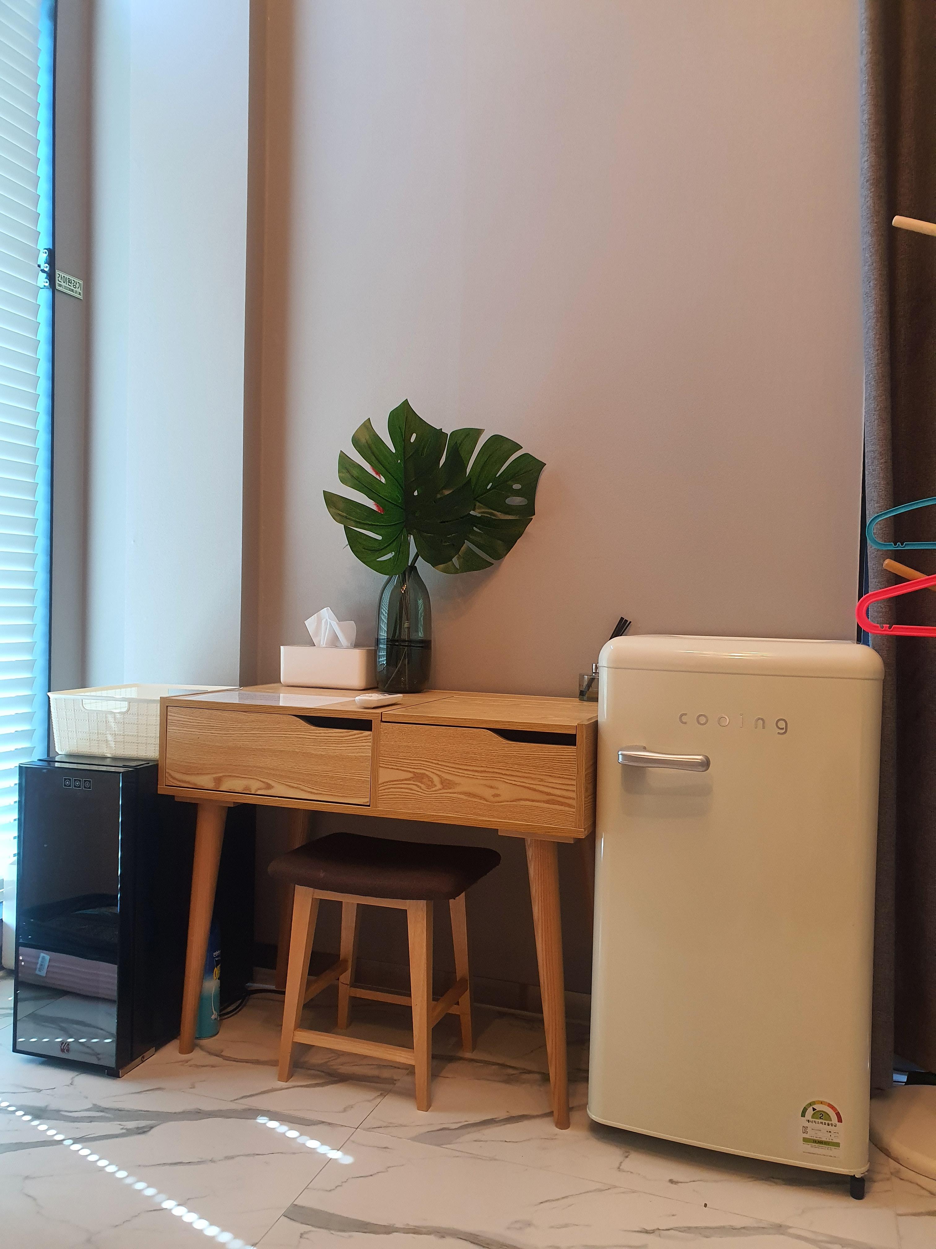 화장대(빗, 드라이기), 와인냉장고, 일반냉장고(생수 2병), 옷걸이가 있고