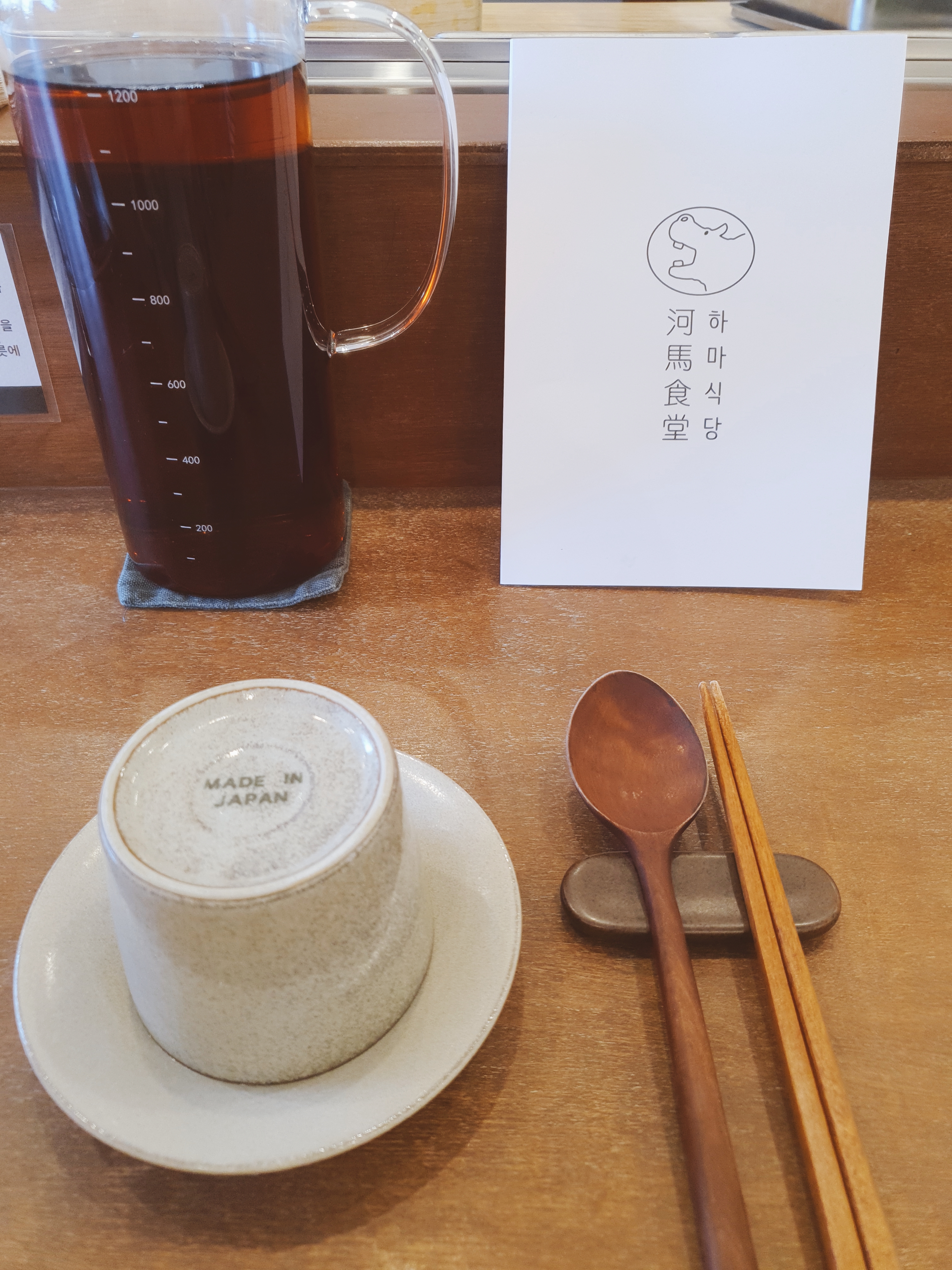 정갈하게 컵, 앞접시와 메뉴판 그리고 물이 셋팅되어있습니다(깔끔)