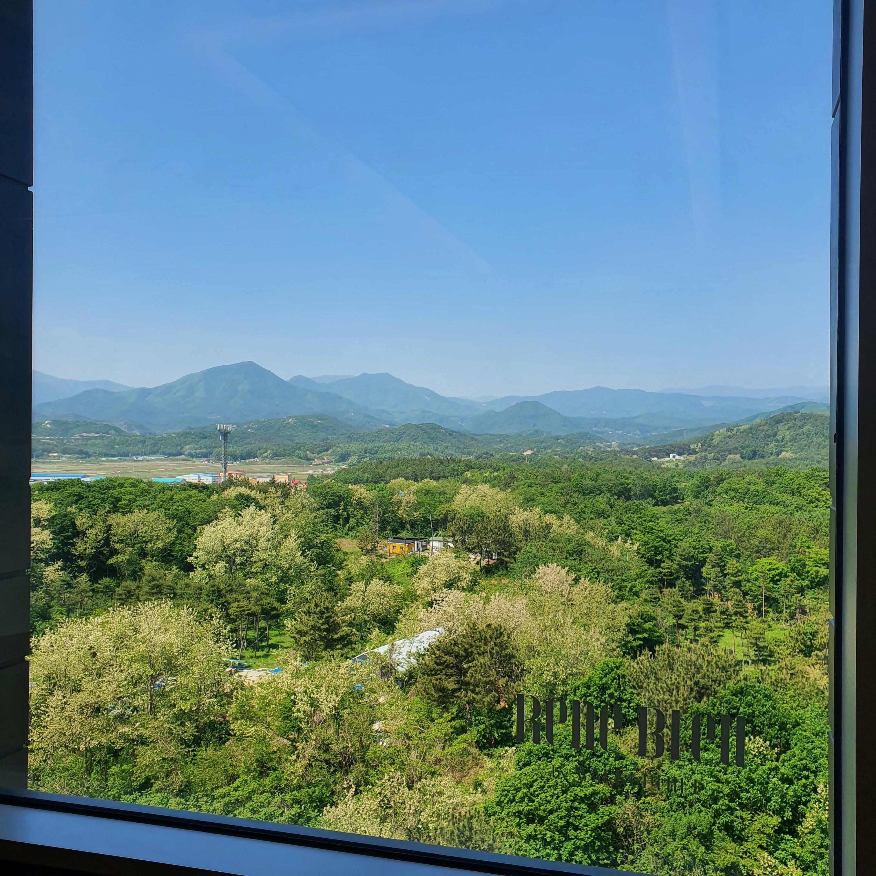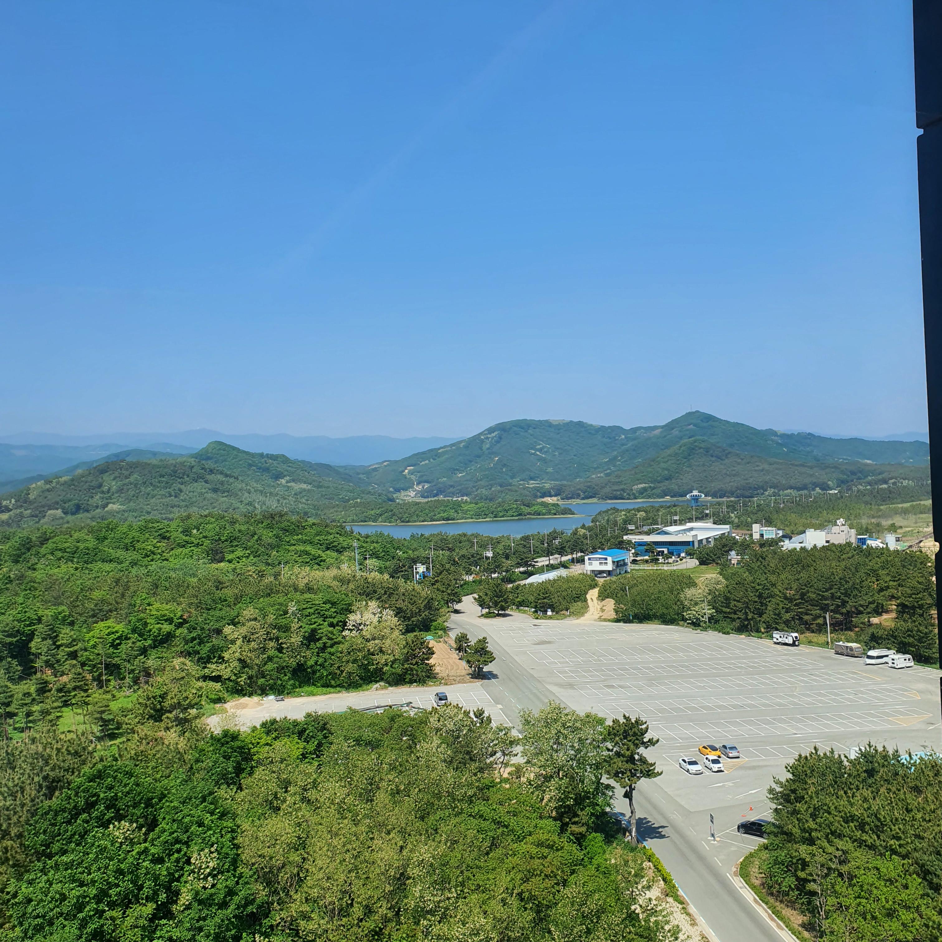 호텔 뒤편으로는 푸릇푸릇한 나무와 산 그리고 송지호가 보이는 뷰입니다
