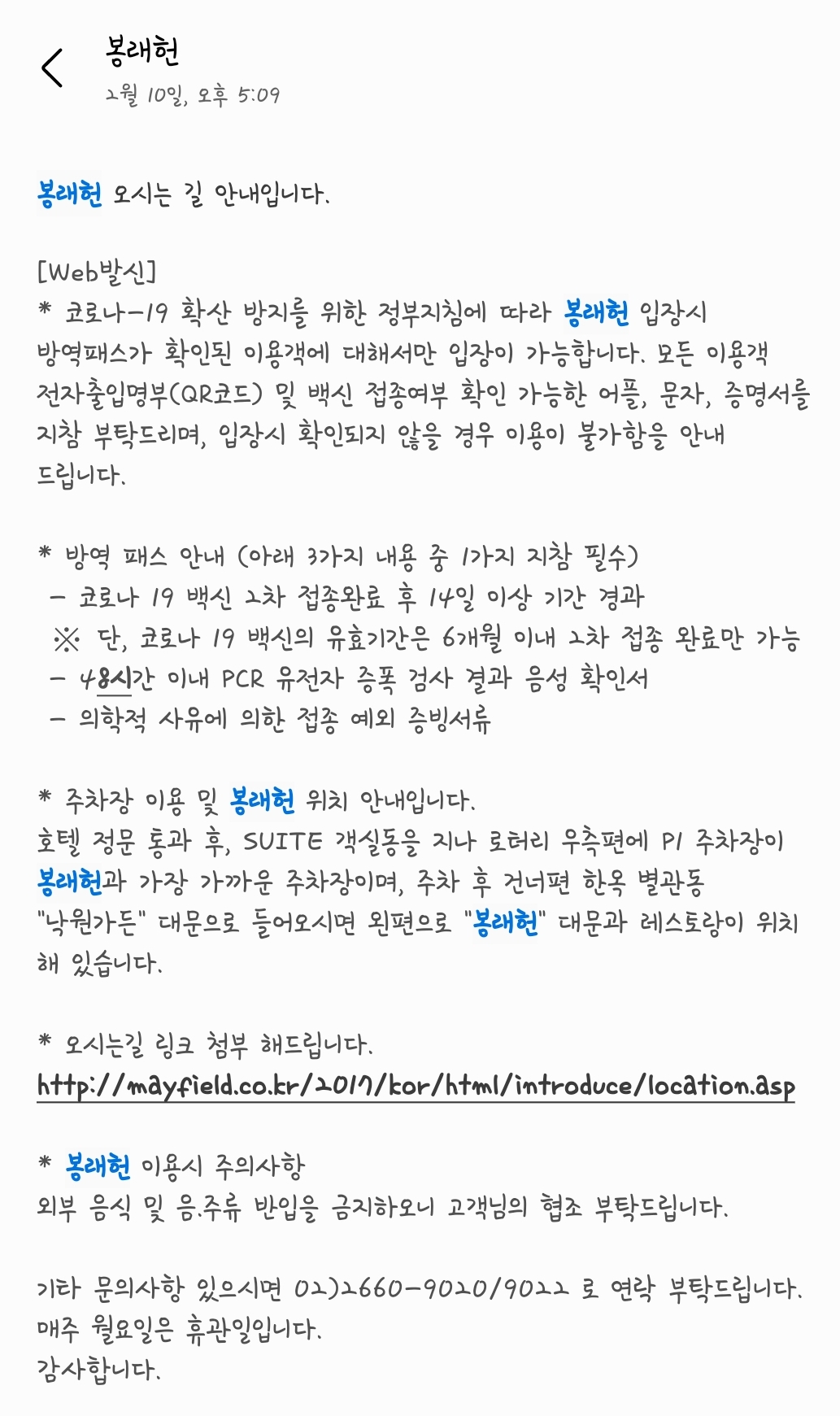 봉래헌 예약 안내문자