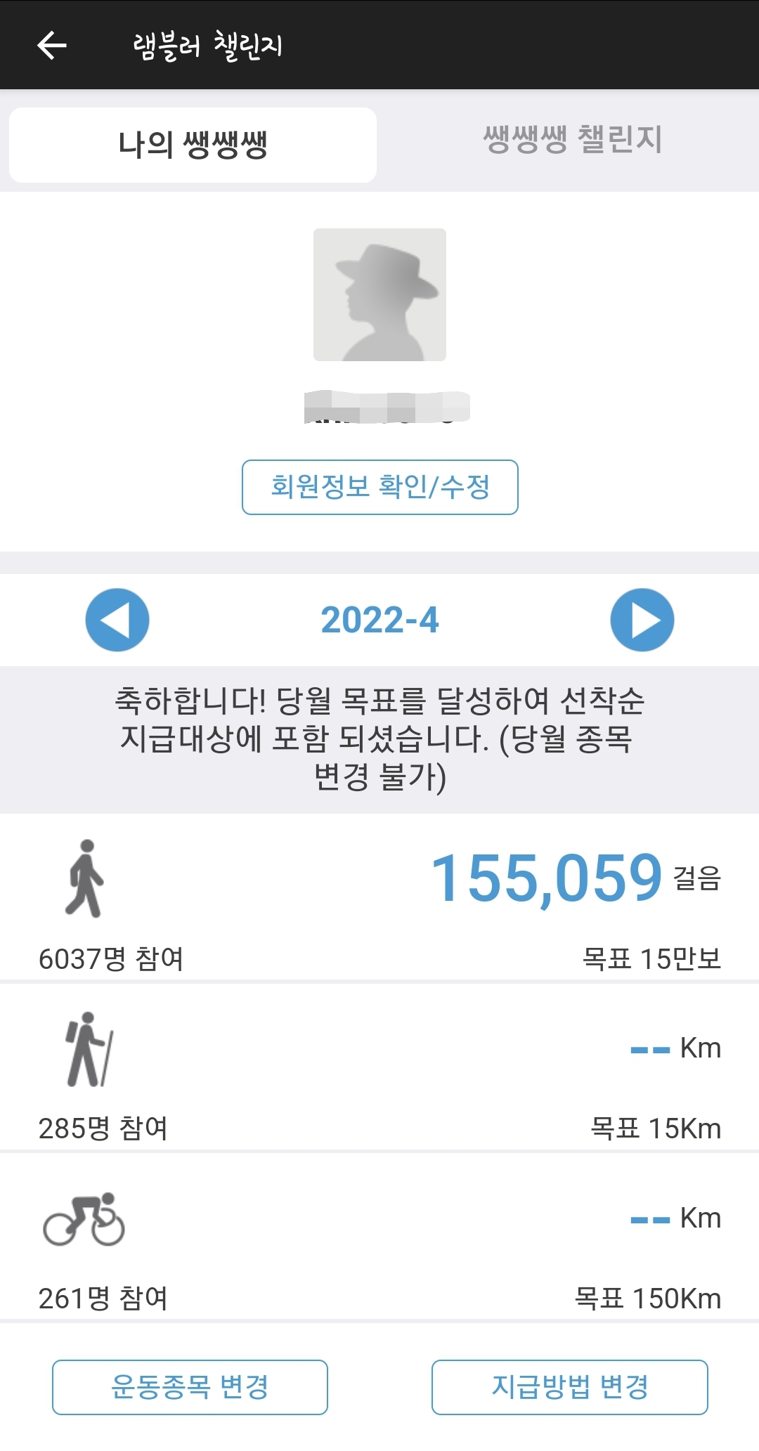 종목(걷기,등산,자전거)은 매월 변경할 수 있습니다
