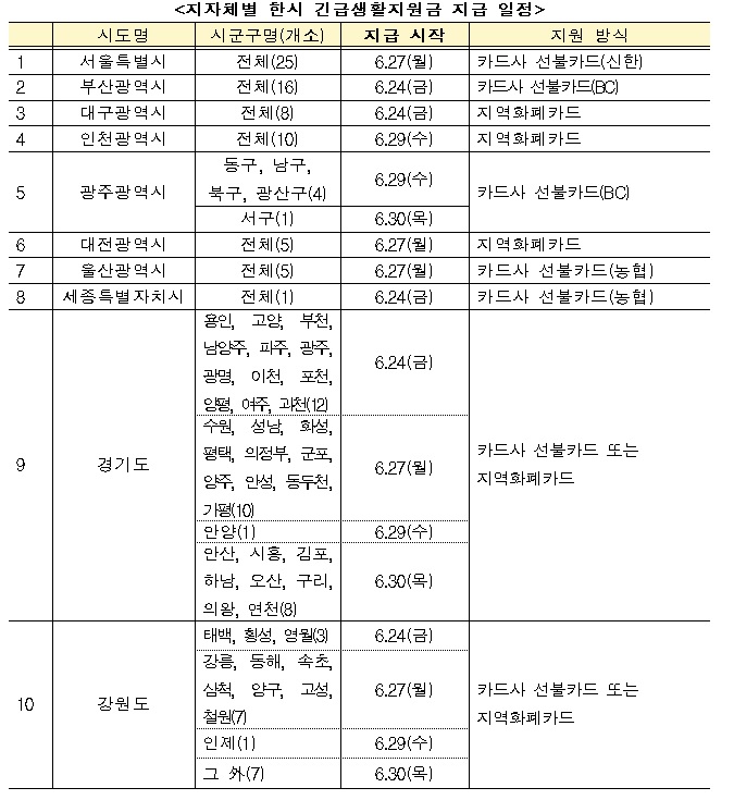 6월 24일부 저소득층 긴급 생활 지원금 지급