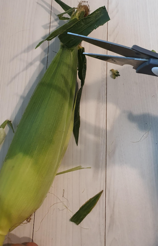 옥수수를 보관하려면 옥수수 껍질을 벗기고 수염을 잘라야 합니다. 그래야 쉽게 벗길 수가 있습니다. 그때 간단히 가위로 수염 윗부분을 자르고 껍질 벗기면 되겠습니다. 참고로 껍질이 생각보다 양이 많아 놀라실 수도 있고 껍질은 일반 쓰레기로 버리시면 됩니다.