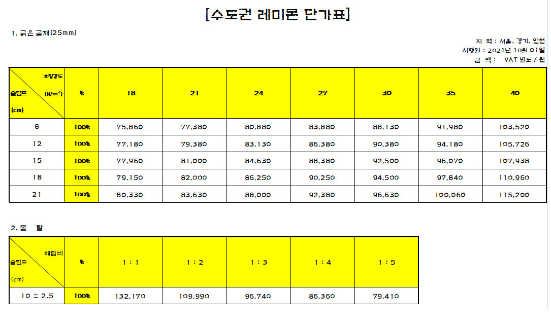 레미콘 가격은 강도 및 슬럼프에 따라 배합 비율이 달라져서 가격이 규격별로 다 다릅니다. 그리고 지역별로 운반비, 골재 가격, 시멘트 가격, 수요공급 등이 다 천차만별이므로 지역별로 가격 차이가 있습니다. 아래의 사진은 수도권 메이저 건설사들과 레미콘 제조사들이 쓰는 단가표입니다. 지금 현재 수도권 지역에서는 아래의 단가표에서 95% 단가를 적용 후 원 단위 절사 한 금액으로 가격이 형성되어 있습니다. 그리고 지역별 및 소량 발주 및 전문건설의 단가표가 다르게 형성되어 있으므로 대략적으로 참고하시는 용도로 봐주시면 감사하겠습니다. 그리고 아래에 수도권 레미콘 단가표를 엑셀 파일로 첨부하였습니다. 적용되는 %만 입력하시면 자동계산이 되는 단가표가 만들어집니다. 다운로드하신 후에 사용하시면 됩니다. 감사합니다.